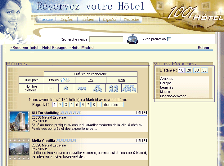hotel Madrid reservationPour réserver votre hotel Madrid, vous devez vous rendre sur le descriptif de l'établissement que vous avez choisi en cliquant sur la vignette ou le lien de la page présentation de l'hotel Madrid. La fiche de visite pour réserver hôtel comporte page une vue d'ensemble, une page chambre, une page Bar/Restaurant, une page Carte pour visualiser la situation de l' hotel Madrid que vous aurez choisi. Il ne vous reste plus qu'à remplir le formulaire de la page reservation de l"hotel Madrid" et à cliquer sur le bouton. hotel Madrid à prix réduitLes prix que nous vous proposons pour reserver votre hotel Madrid sont négociés directement avec les hôteliers qui sont nos partenaires et remplissent eux même leur grille deprix . Afin que le prix de votre hotel Madrid soit toujours avantageux pour vous, n'hésitez pas à chercher afin de reserver hotel Madrid. hôtel Madrid avec 1001--hotel.comHesperia