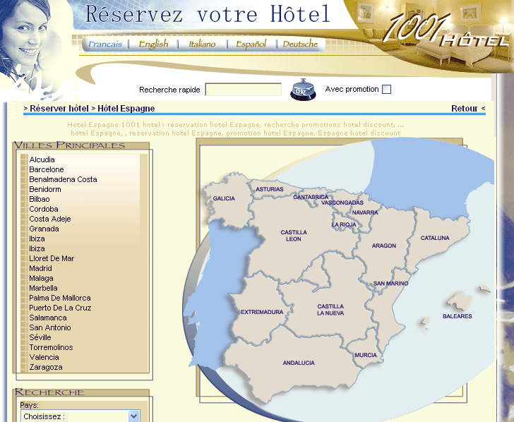 hotel espagne reservationPour réserver votre hotel espagne, vous devez vous rendre sur le descriptif de l'établissement que vous avez choisi en cliquant sur la vignette ou le lien de la page présentation de l'hotel espagne. La fiche de visite pour réserver hôtel comporte page une vue d'ensemble, une page chambre, une page Bar/Restaurant, une page Carte pour visualiser la situation de l' hotel espagne que vous aurez choisi. Il ne vous reste plus qu'à remplir le formulaire de la page reservation de l"hotel espagne" et à cliquer sur le bouton. hotel espagne à prix réduitLes prix que nous vous proposons pour reserver votre hotel espagne sont négociés directement avec les hôteliers qui sont nos partenaires et remplissent eux même leur grille deprix . Afin que le prix de votre hotel espagne soit toujours avantageux pour vous, n'hésitez pas à chercher afin de reserver hotel espagne. hôtel espagne avec 1001--hotel.comHotel espagne HM Jaime III 07012 Palma De Mallorca