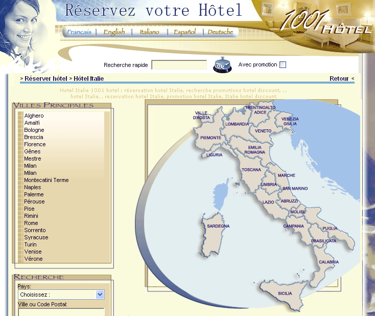 hotel italie reservationPour réserver votre hotel italie, vous devez vous rendre sur le descriptif de l'établissement que vous avez choisi en cliquant sur la vignette ou le lien de la page présentation de l'hotel italie. La fiche de visite pour réserver hôtel comporte page une vue d'ensemble, une page chambre, une page Bar/Restaurant, une page Carte pour visualiser la situation de l' hotel italie que vous aurez choisi. Il ne vous reste plus qu'à remplir le formulaire de la page reservation de l"hotel italie" et à cliquer sur le bouton. hotel italie à prix réduitLes prix que nous vous proposons pour reserver votre hotel italie sont négociés directement avec les hôteliers qui sont nos partenaires et remplissent eux même leur grille deprix . Afin que le prix de votre hotel italie soit toujours avantageux pour vous, n'hésitez pas à chercher afin de reserver hotel italie. hôtel italie avec 1001--hotel.comHotel