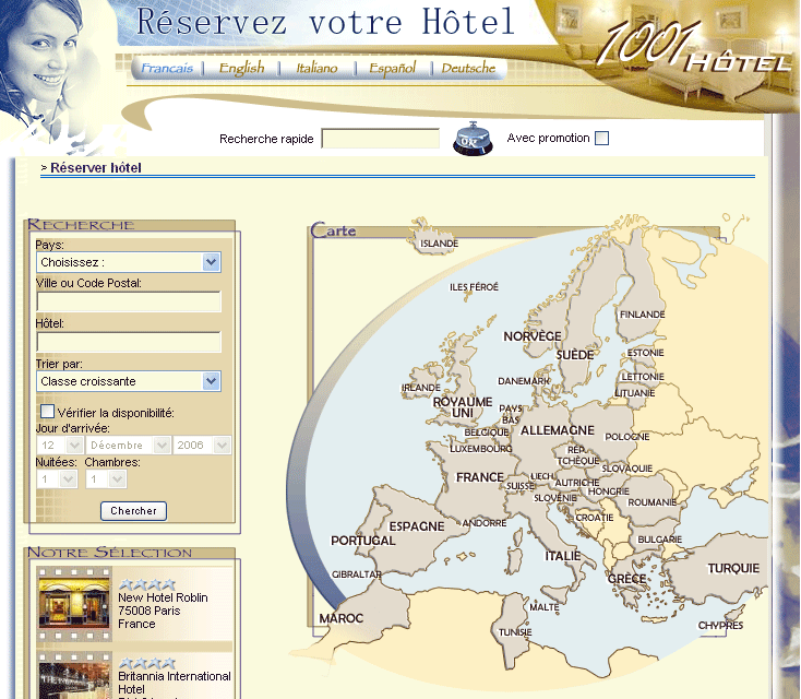 hotel offre reservationPour réserver votre hotel offre, vous devez vous rendre sur le descriptif de l'établissement que vous avez choisi en cliquant sur la vignette ou le lien de la page présentation de l'hotel offre. La fiche de visite pour réserver hôtel comporte page une vue d'ensemble, une page chambre, une page Bar/Restaurant, une page Carte pour visualiser la situation de l' hotel offre que vous aurez choisi. Il ne vous reste plus qu'à remplir le formulaire de la page reservation de l"hotel offre" et à cliquer sur le bouton. hotel offre à prix réduitLes prix que nous vous proposons pour reserver votre hotel offre sont négociés directement avec les hôteliers qui sont nos partenaires et remplissent eux même leur grille deprix . Afin que le prix de votre hotel offre soit toujours avantageux pour vous, n'hésitez pas à chercher afin de reserver hotel offre. hôtel offre avec 1001--hotel.comHotel Europe offre |